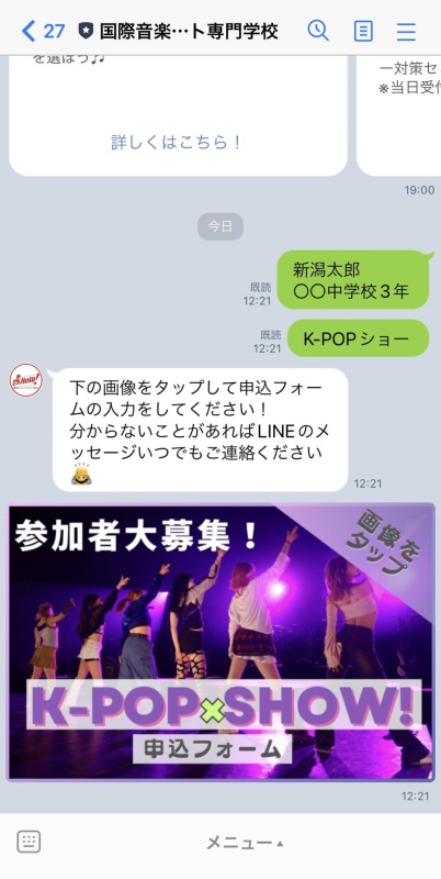 2:トーク画面に「お名前(フルネーム)」と「K-POPショー」と送信