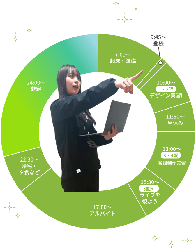 - 日頃の授業は様々な視点からエンタテインメントについて学べます。実践的な授業ばかりなので知識と経験を積むことができます!また様々な職種に触れることができるので、私は授業の中でやりたいことが見つかりました!同じ学科の仲間たちともお互いに支え合い、たくさん刺激をもらっています!