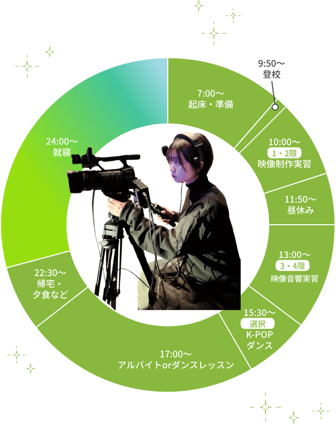 MVやCM、YouTubeなどの動画コンテンツを、現役クリエイターによる直接指導で学ぶことができます!動画制作の実習授業で、業界で求められる技術と実践力を身につけます。