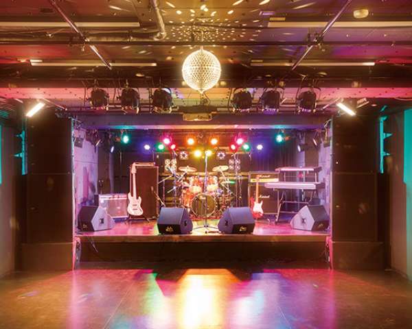 着席で100名、スタンディングで250名収容の本格的ライヴハウス。プロと同じ最先端の機材を使った環境での練習ができ、かつ実際のライヴを行うことも可能です。また、プロのアーティストをお迎えしてのライヴもここで行います。