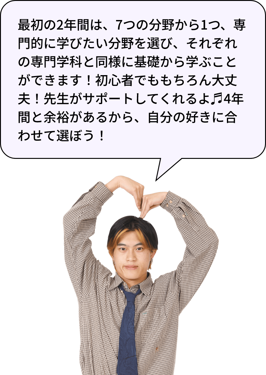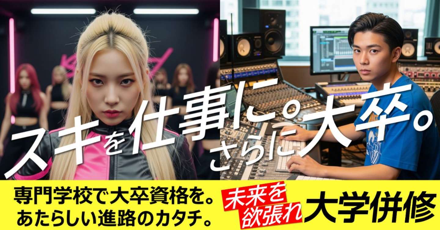 あなたの好きな音楽・エンタメを学びながら、卒業と同時に大卒資格を取得できるとてもめずらしい学科です。将来やりたいことが決まっていない人や、興味のあることがたくさんある人にピッタリ!
